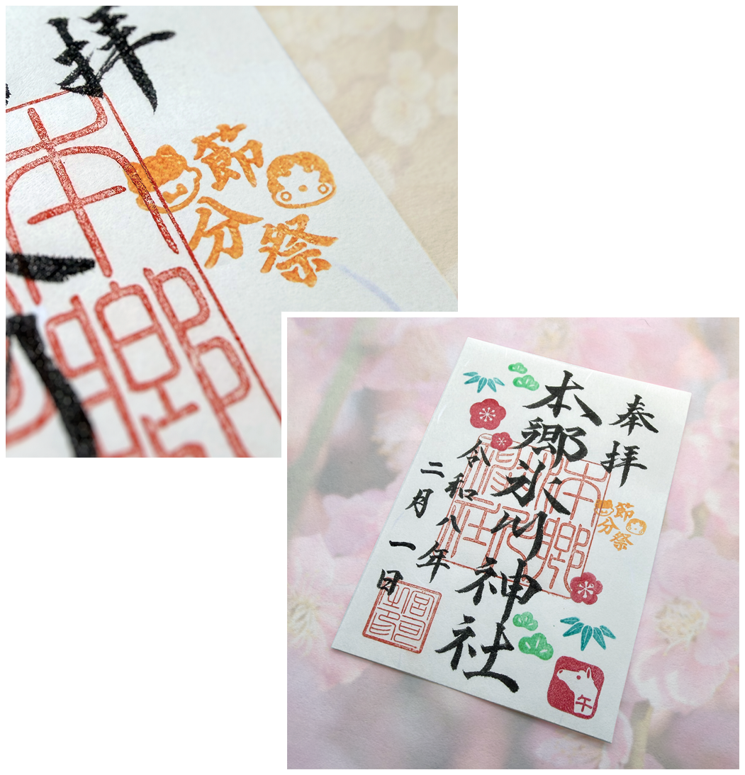 今年の干支 (午) と季節の花や草木の絵柄を添えた御朱印を頒布しております。1 月、2 月は松竹梅です。ご参拝そして御祭神とのご縁の証にどうぞお受けください。2 月 15 日までは「節分祭」の印を加えてのお渡しです。