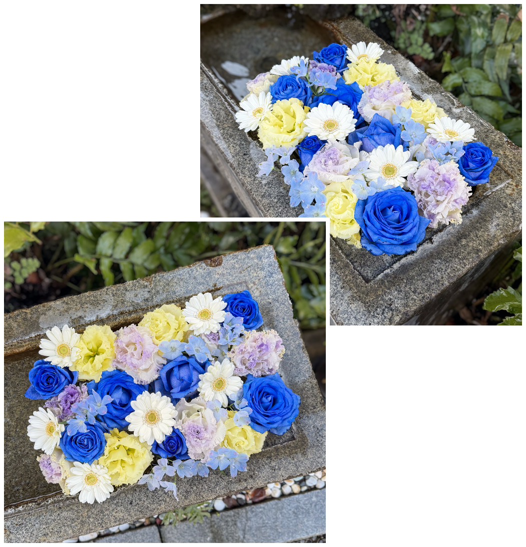 毎月の朔日 ( 1 日) に季節の花を飾った花手水で皆様をお迎えしております。2 月はこの季節の澄み切った空気をイメージして青系のバラ、デルフィニウム、トルコキキョウ、ガーベラを浮かべました。