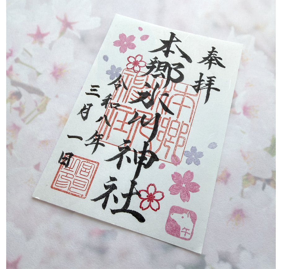 御朱印は神社やお寺への参拝の証としてお頒ちする印章です。ご来社の際はまず御神前にお参りいただいてから社務所にお越しください。3 月の季節の御朱印の絵柄は桃色、茜色、薄紫色の「さくら」です。神社印・宮司印のみを押した通常の御朱印をご希望の方は受付の際にお申し付けください。