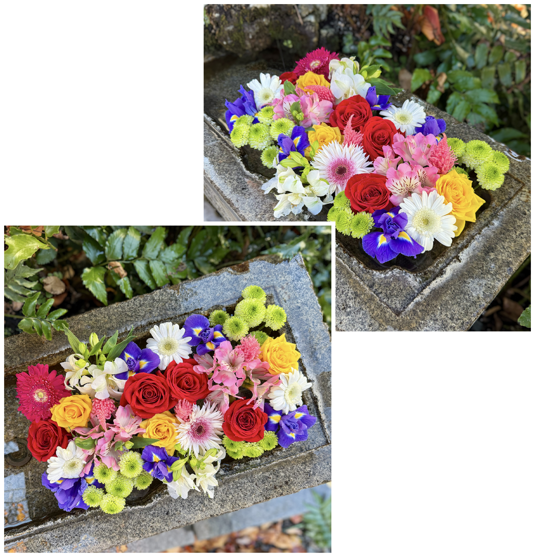 毎月の朔日 ( 1 日) に季節の花を飾った花手水で皆様をお迎えしております。12 月は一年の締めくくりを華やかに彩るべくバラ、アイリス、アルストロメリア、ケイトウ、ガーベラ、スプレー菊等色とりどりの花を浮かべました。